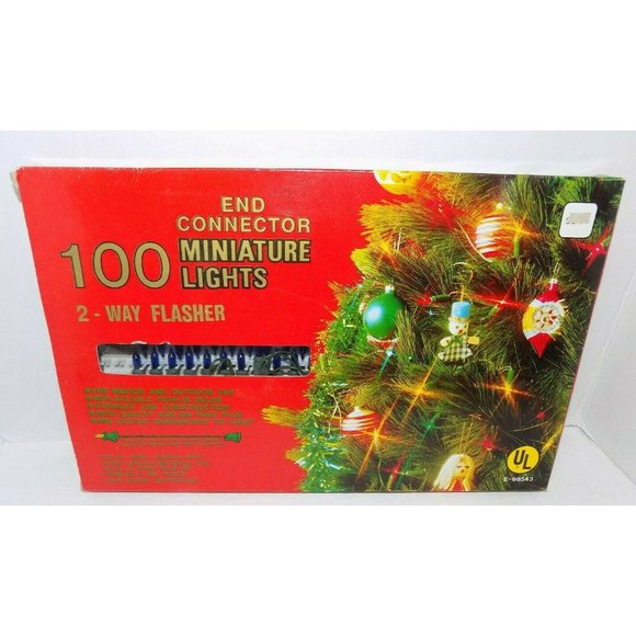 New in original box. 100 Blue Christmas string light set. 2 way flashing. End connector. Safety fuse plug.