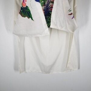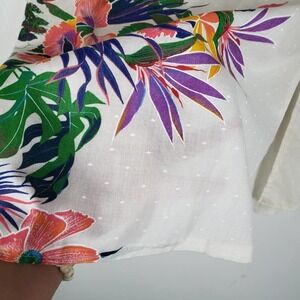 Key features: white with subtle dots, multicolor tropical floral print on the front, side zip and button, knee length, lightweight