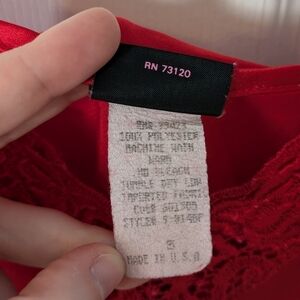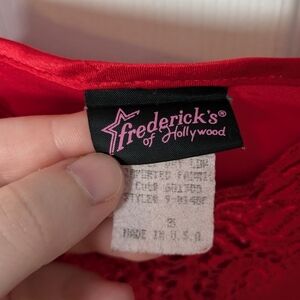 Satin, Top, Shirt, Lingerie, Sexy, Sensual, Lace, Crochet, Lacey, Lacy, V-Neck, Spaghetti Straps, Slip, Camisole, Cami, Slip Tank, Negligee, Neglige, Retro, Vintage, Red, Bright Red, Fredrick's of Hollywood, Made in the USA, Made in the U.S.A., US Made, Polyester, 100% Polyester, Size Small, Size S, Night, Nightie, Sleepwear, Tank Top, Tank, Jewel Tone, Adjustable Straps, V-Neck, Silky, 90s, 1990s, 80s, 1980s, RN 73120