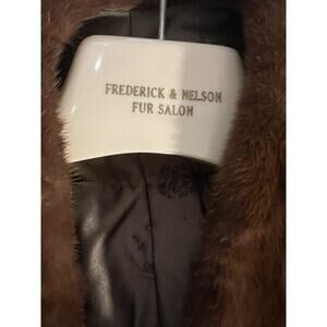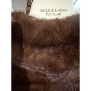 This Vintage Fredrick & Nelson Fur Salon Woman's Mink Shawl is a luxurious and stylish coat from the 1960s. The shawl is lined with silk and features pockets, making it both practical and elegant. Made in the United States, this original mink coat in brown is in a size M/L, perfect for regular-sized women looking to add a touch of vintage glamour to their wardrobe. Comes with the original hanger from Fredrick and Nelson fur salon