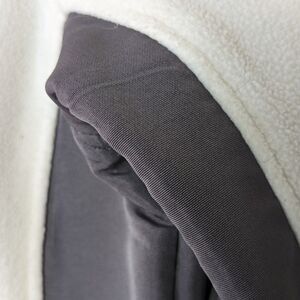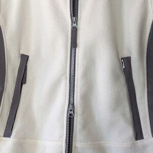 This lightly worn cream fleece zip up liner jacket is stylish enough to hold its own in cool weather. Accented with grey panels to add interest and ease of movement. Velcro tightened cuffs, two zipped front pockets, and an upright mock neck to keep you cozy. Excellent used condition.
