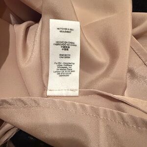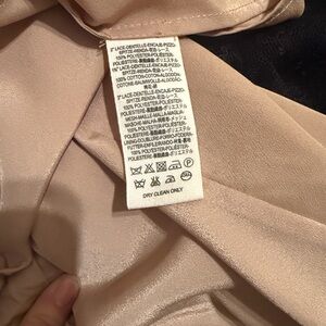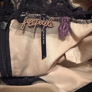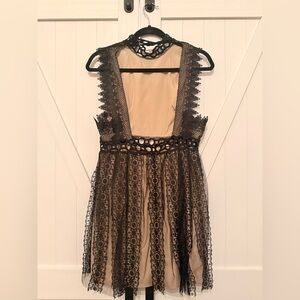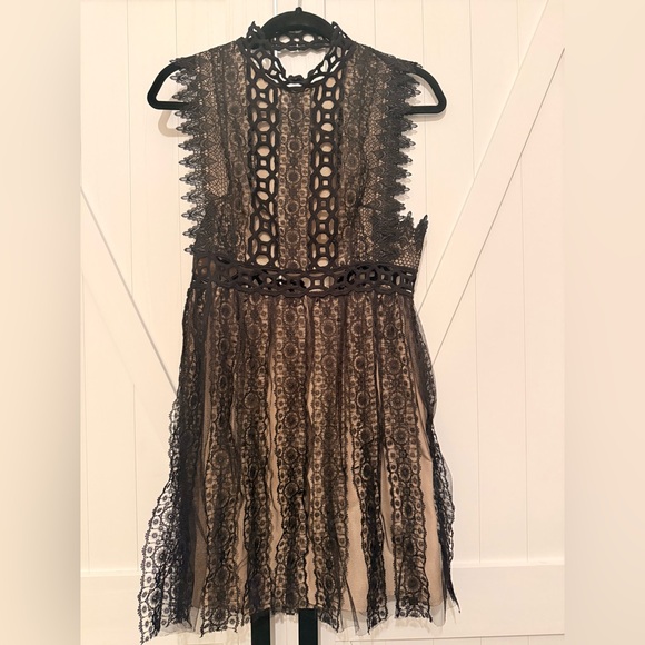 Chic dress with black lace overlay. Cream underlay adds elegance. Ideal for evening wear. Backless.