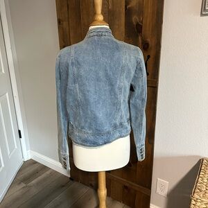 Chic light blue denim jacket. Features stylish brass buttons. Perfect for a trendy look. Never worn, new without tags.