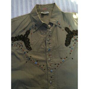 Vintage Freego Womens Medium Beige Western Beaded Shirt Button Down Long Sleeve