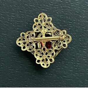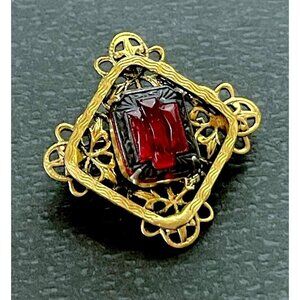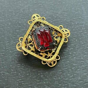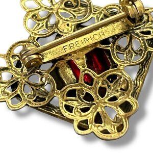 Vintage Freirich Brooch Ruby Red Glass Gold Tone Filigree Pin Victorian Revival