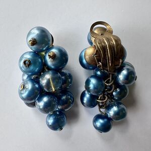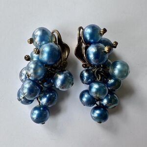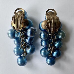 Vintage French glass berry or grape cluster glass bead drop earrings with a clip on closure, circa approximately the 1930s. The glass beads are clear blown glass with an inner layer that gives them their blue color - it has a sheen to it that makes them appear slightly pearlescent or metallic. The beads are hand wired to the earring back, finished with fluted metal beads at the top, and dangle at the drop with a chain and head pin construction. The clip backs are marked Made France. I previously had these listed simply as vintage French earrings, and personally believed they might have been designed by Edouard Colonna - but recently I was researching a different piece of jewelry and came across some information that suggests these may be by Maison Gripoix, back when it was still named Maison Gasse in the 1930s (it was of course headed by the Gripoix family, but they changed the name of their company later). During that era Maison Gripoix produced some collections that made use of blown glass in addition to their more widely recognized lamp work and enamel, and one Womens Wear Daily Article from 1935 describes a collection as using components that appear almost like iridescent soap bubbles - after reading I took a closer look at these earrings and realized the metalwork on the backs is quite similar to that on the back of a late 1920s-1930s Chanel necklace I have listed separately that is by Maison Gripoix.