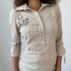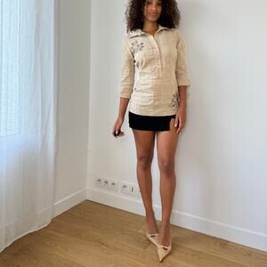Beige textured popover blouse with black floral embroidery at chest and hip, half-button placket, pointed collar, and 3/4 sleeves with gentle cuff. Tailored through the waist for a flattering fit. Hand sourced in France. Free shipping on bundles <3