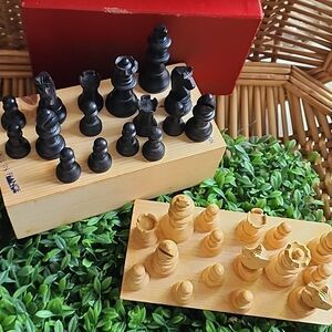 Vintage, carved wooden chess pieces are housed inside a wooden box with lid.