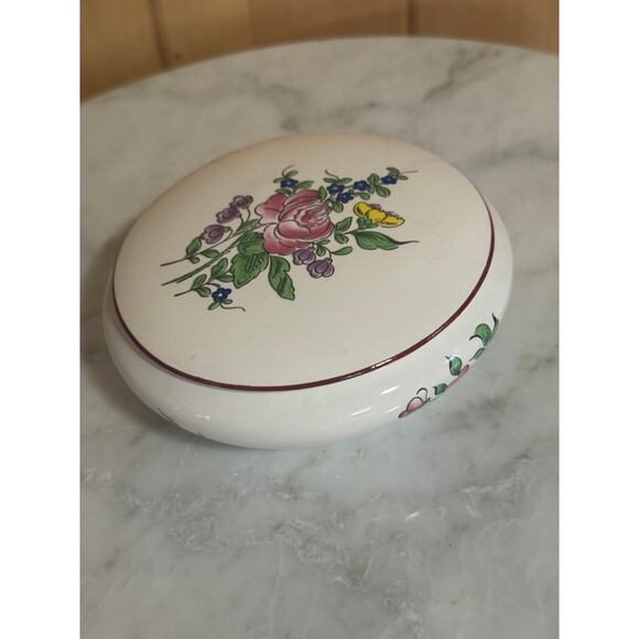 Cute and sweet vintage French ceramic jewelry box. Painted floral pattern. Box has a 5" diameter and is approximately 1.5" high. Marked on bottom.