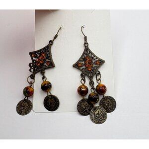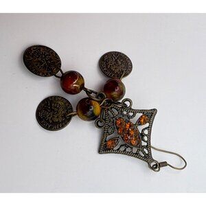 These earrings showcase a vintage-inspired design featuring orange rhinestones, colorful beads, and coin charms, offering a sophisticated and unique accessory choice.