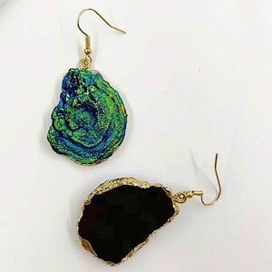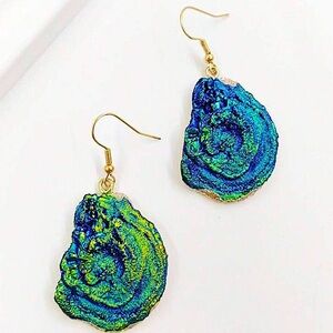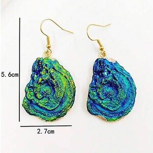 Vintage French Crystal Blue Shell Design Gold Dangle Boho Earrings