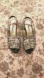 Gorgeous heels that have a cage-like top with golden metal hardware. It feels like the multi blue and gold stripes could be made of suede while the rest of the heel is leather. The heels were made out of Italy and stamped as such. The ball of the foot area of the heels have been professionally replaced with those that have traction. A few nicks on arch & heel area but not super noticeable. Excellent vintage condition!