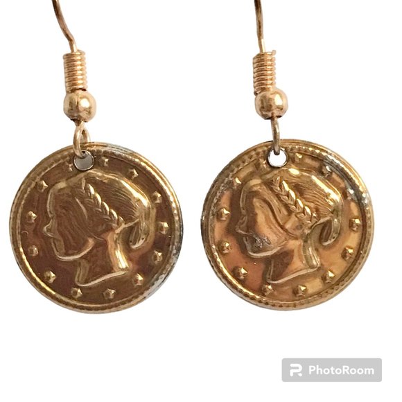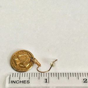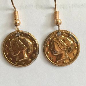 Vintage French Italian Coin Earrings Dangle Gold Plated Wire France Italy Lady