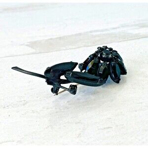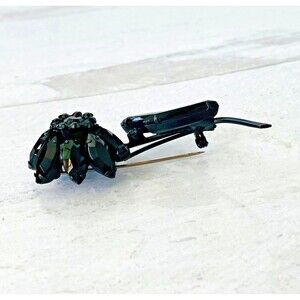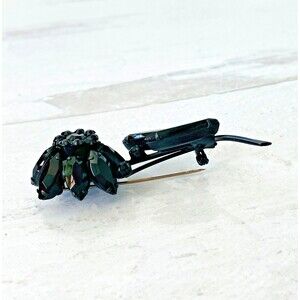 Vintage French Jet Black Dahlia Flower Brooch Pin Japanned Metal Rhinestones