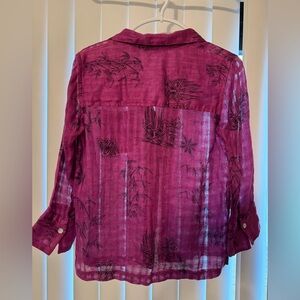Chic magenta sheer shirt with button-down style. Features elegant black patterns. Perfect for stylish occasions.