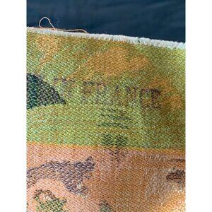 This vintage tapestry square captures a charming rustic scene, featuring villagers in a warm, earthy palette. Intricately woven, it portrays a moment of everyday life with barrels in the backdrop. The worn edges and vibrant colors add to its antique appeal, making it a unique addition to a collection.
