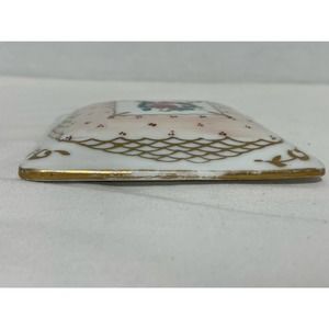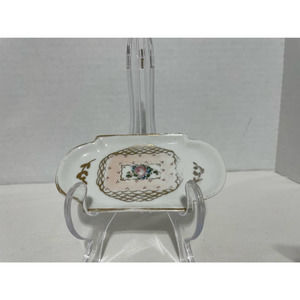 Delicately whimsical three-piece vintage French trinket boxes. The round butterfly box is a Limoges from France, approximately 2" W x 2" L x 1" H. The next two pieces have a similar design and the same markings of makers. Both pieces are handpainted with some wear on the design where it has been handled but otherwise beautiful design. The tray has some dark markings on the bottom, please refer to the photos. All the pieces in this vanity set do not have any chips or cracks.