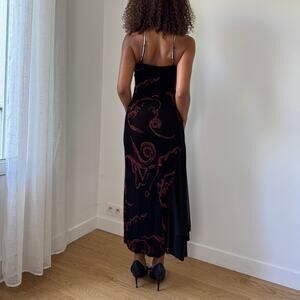 Made in France. Black floor-length gown with red glitter swirl design, crystal-embellished bust detail, and adjustable straps. Fitted bodice with flowing sheer layered hem. Free shipping on bundles <3