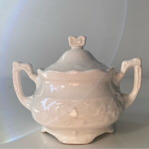 This sugar bowl exemplifies the timeless beauty of French ironstone, which was popularized in the early 19th century as a durable yet elegant alternative to porcelain. French ironstone pieces like this one were often used in everyday dining but have become highly collectible due to their durability and classic design.