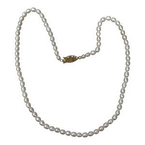 Elevate your style with this exquisite vintage freshwater pearl necklace. Its timeless elegance and intricate gold clasp add a touch of sophistication to any ensemble. Perfect for special occasions, this necklace is a must-have for those who appreciate the beauty of classic jewelry.