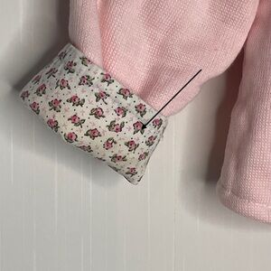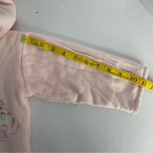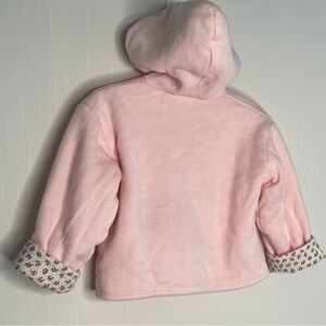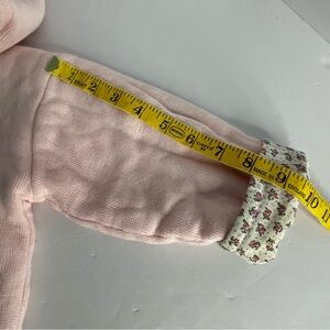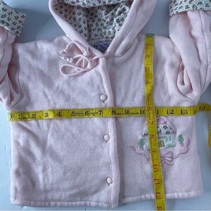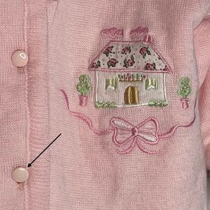 Good preowned condition. Adorable hooded, lined rosebud print hood and cuffs, sweater jacket. Sleeves can be cuffed or uncuffed for extended wear. Front buttons, some fade on buttons see pictures with arrows. Cuffs have some discoloration/stain. Embroidered house and trees with bow. Soft warm100% acrylic sweater, lining is not acrylic but not mentioned on tags. Please check measurements in pictures, vintage sizes vary and no size tag. ✔️Listed as 12-18 months