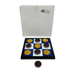 Vintage Friendly Home Parties Cookies & Cracker Chess Checkers Set. In good preowned vintage condition with some factory made flaws (see circled pics). It does not appear that this has ever been played. Blue and white checkerboard with cookies and crackers pieces. Comes with the original box and original packaging.