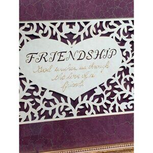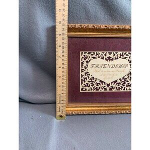 An elegant framed artwork featuring a heartfelt "Friendship" quote. The ornate gold frame and intricate cutout design complement the burgundy background, making it a tasteful addition to any decor.