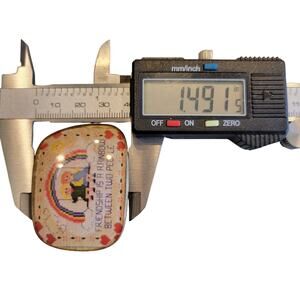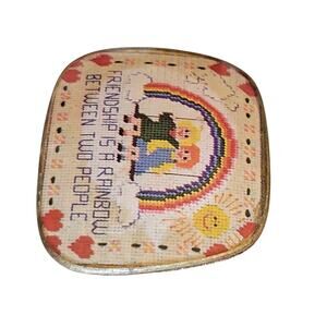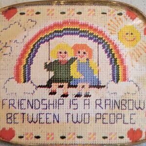 Vintage rectangular brooch featuring two girls on a swing under a rainbow with the phrase “Friendship is a rainbow between two people.” Measures approx. 2.03" x 1.49".
