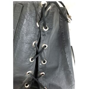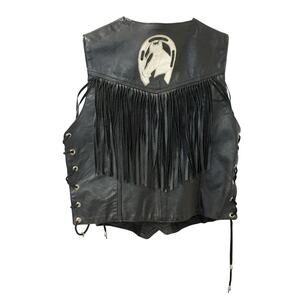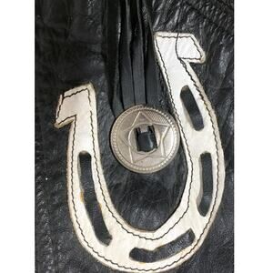 Badass vintage black leather vest with bold biker-meets-rodeo energy. Features long fringe front and back, silver horseshoe patches at the shoulders, and an epic horse-in-horseshoe patch on the back. Adjustable lace-up sides and snap closure. Fully lined. Great for festivals, bike rallies, rodeo weekends, or desert nights.