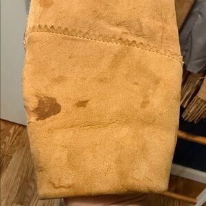 Elevate your style with this chic tan leather jacket featuring elegant fringe details. Perfect for a trendy, western-inspired look. The pocket is torn at the corner. And there are some spots that need cleaned. Both issues shown in photos.
