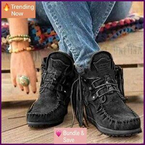These vintage-inspired ankle booties blend retro cowboy style with everyday comfort. Lightweight and versatile, they feature a classic fringed design and a comfortable low heel, making them a perfect addition to any casual wardrobe.