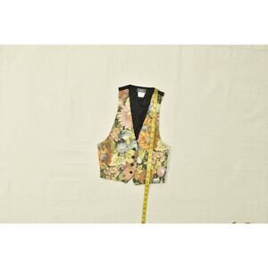 This beautiful vintage Fritzi tapestry vest is a unique addition to any wardrobe. Featuring a stunning floral pattern in a mix of earthy tones, including green, blue, brown, and pink, it evokes a classic, bohemian style. The vest has a button-down closure with four black buttons and a solid black satin lining for a comfortable fit. The material has a substantial weight and texture, typical of tapestry fabric. Perfect for layering over a simple top for a casual or semi-formal occasion, it's a versatile piece that adds a touch of retro charm. This pre-owned item is in excellent used condition with no visible stains, tears, or major flaws, and has been well-preserved over time. See all photos for a closer look at the intricate details and precise measurements. It's a women's regular Size Small, and its armpit-to-armpit measurement is approximately 18 inches, and the length from the top of the shoulder to the bottom of the front hem is approximately 21 inches.