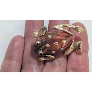 Add a touch of whimsy to your outfit with this charming vintage frog brooch. Rhinestone accents and gold-tone legs make it a delightful accessory.