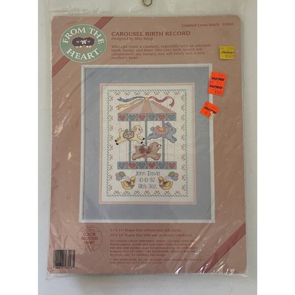 Vintage From the Heart Cross Stitch Kit Seal NOS 1991 Carousel Birth Record