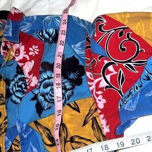 This vintage shirt features a vibrant floral patchwork design with bold colors. Its classic button-down style offers a polished, yet unique look.