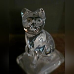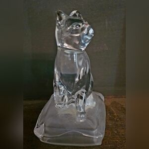 This vintage Cristal d'Arques glass cat figurine from France features a sleek, clear crystal cat resting on a frosted glass pillow. With its elegant lines and subtle details, it’s a beautiful piece for tabletop or shelf display. A lovely blend of charm and sophistication—perfect for cat lovers or crystal collectors.