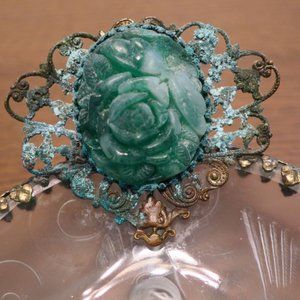 Vintage Frosted Glass Dish with Raised Birds, Copper Accents and Decorative Green Rose