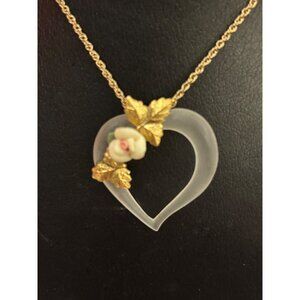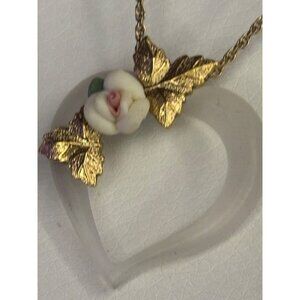 • Pendant: Frosted lucite heart, porcelain rose, gold-tone leaves