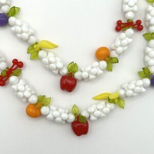 The vintage fruit necklace features white plastic interlocking beads that alternate with a variety of fruits and leaves including bananas, lemons, cherries, eggplant, apples, oranges and pears. The necklace measures 26 inches without a clasp. Designed to slip over the head. Fruit Salad Tutti Frutti.