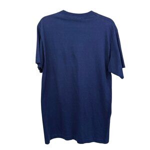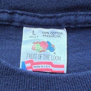 A rare piece from 1993, this navy Fruit of the Loom T-shirt showcases an embroidered crest representing Washington D.C. Crafted with 100% preshrunk cotton, it remains a classic design.