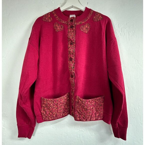 Vintage Fruit Of The Loom Womens Button Cardigan Sweater Red with Floral Accents