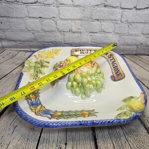 Introducing a magnificent vintage fruit platter from La Compagnia dei Decori, a distinguished name in Italian craftsmanship. This exquisite piece is adorned with an intricately embossed design of seasonal fruits, celebrating the vibrant colors and textures of nature's harvest. Measuring an impressive 16 inches by 16 inches, it serves as both a functional serving dish and a stunning statement piece, destined to be the focal point of your dining table or gathering.