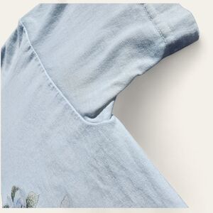 Vintage Fruit of the Loom t-shirt in a soft, faded white with a vibrant cardinal and floral print on the front. Made from a comfy 50/50 cotton-poly blend, this tee offers a lightweight, broken-in feel perfect for casual wear or layering. Graphic shows cracking typical of vintage age, adding character without compromising structure. A charming piece for bird lovers, vintage collectors, or those drawn to nature-inspired graphics.