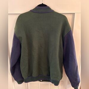 Stylish men's varsity jacket in green and blue. Perfect for casual outings and adding a sporty touch to your wardrobe.