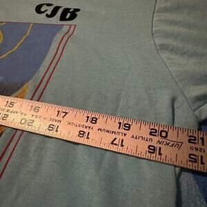 ☆ Features: Soft blue tee with bold front graphic of electric guitars and neon accents, “Neon Nights” text at the bottom, and “CJB” personalization on the chest. Printed on a made-in-USA Fruit of the Loom Best tag.