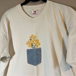 Vintage Fruit of the Loom cream single stitch shirt with pocket of daisies on front.