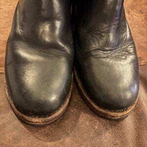 Vintage Sabrina Chelsea Frye boots. Black leather and brown heel, no longer available from Frye. Old logo inside, measures to a size 10, embossed F logo on the outer heel. Vibram soles are in great shape and the leather is soft and will mold to your feet. Perfect for someone who loves the vintage styling of the campus boot but wants something shorter and more versatile.