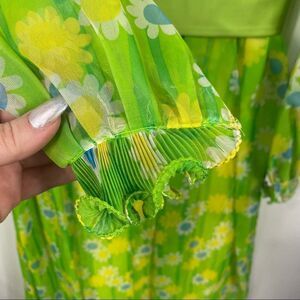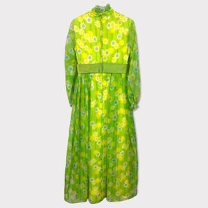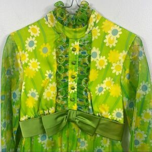 Vintage Full Length 60s floral flower power Bow Ruffle long sleeve dress