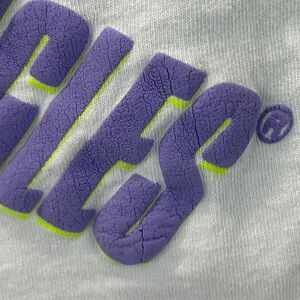 Has a spot on the lower back and the puffy paint has some cracking. No other flaws noticed. Tag is a Large but I feel it measures more similar to a modern Medium or Short Large. Check measurements to ensure fit. See photos.