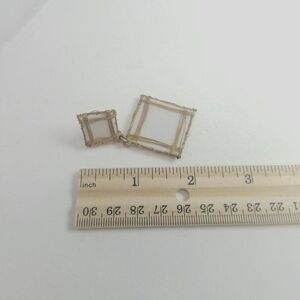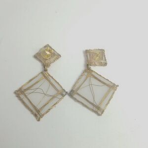 Vintage Funky Wired Square Dangle Stud Earrings, White and Gold Tone Estate